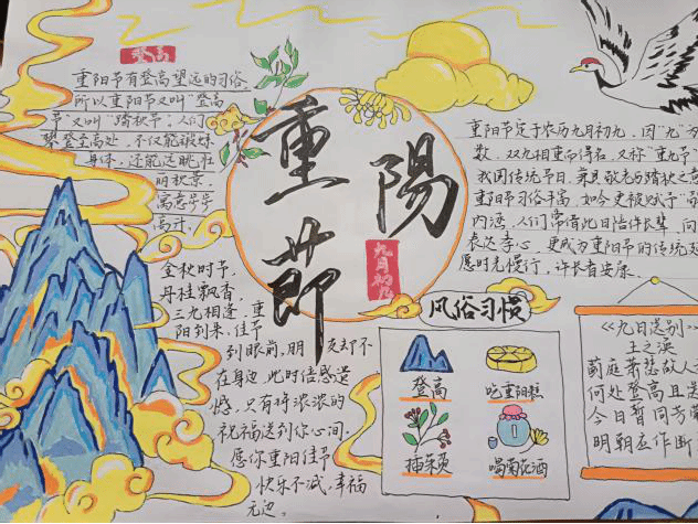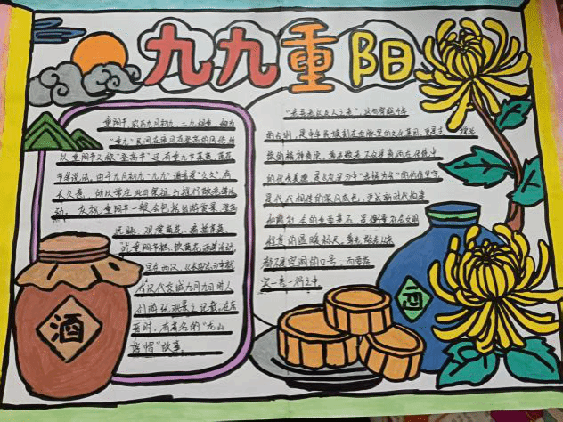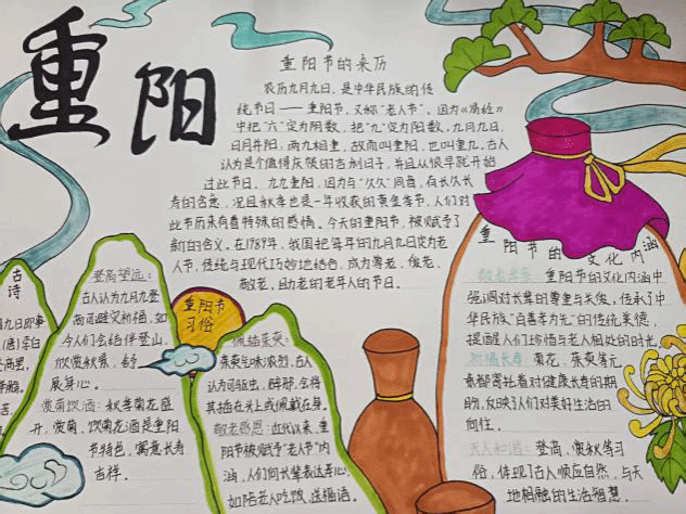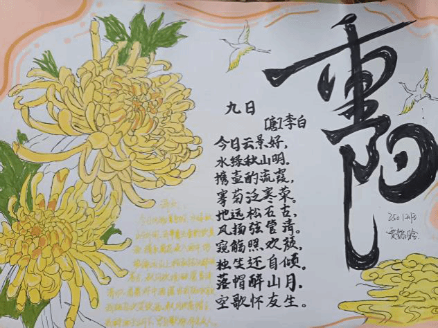 一张张手抄报,或描绘遍插茱萸、登高望远的重阳图景,或书写“老吾老以及人之老”的经典箴言,或记录与长辈相处的温暖瞬间。每一笔、每一划,都饱含着同学们对传统节日的理解;每一种色彩、每一个图案,都承载着对长辈最纯粹的敬爱。经过层层筛选,一批主题鲜明、创意独特、制作精美的优秀作品脱颖而出,现将部分佳作展示如下,与大家共赏这份重阳限定的温暖与感动。