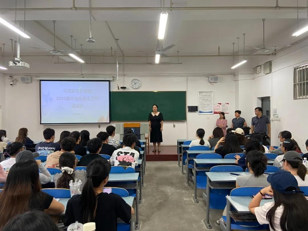 为做好2025届毕业生就业指导服务工作,帮助学生认清严峻的就业形势,合理规划就业目标,进一步提升毕业生求职意识和就业能力,提早进入备战状态,马克思主义学院于9月5日在明德楼B0223组织召开了2025届毕业生就业动员大会。出席会议的有马克思主义学院院长刘维春、教学副院长申晓玲,就业帮扶单位部门领导悉数到场,他们是校宣传部部长田建邦、纪委综合室主任王磊、招生就业处副处长李小勇,马院2025届全体毕业生参加了本次活动,会议由党总支书记刘永平主持。